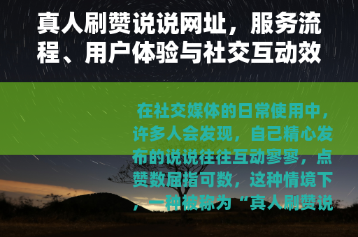 在社交媒体的日常使用中,许多人会发现,自己精心发布的说说往往互动寥寥,点赞数屈指可数,这种情境下,一种被称为“真人刷赞说说网址”的服务逐渐进入视野,它通过真人用户为说说增加点赞,旨在提升互动表现,作为一名长期关注社交动态的用户,我最初对此感到好奇,随后尝试了相关服务,并观察了其运作方式,本文将围绕这一主题,分享详细的服务流程、实际案例以及个人思考,避免笼统的论述,力求呈现真实、细致的视角。