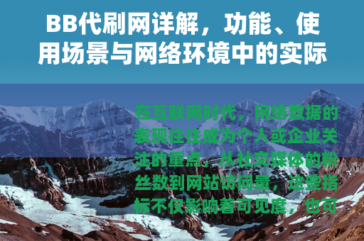 在互联网时代,网络数据的表现往往成为个人或企业关注的重点,从社交媒体的粉丝数到网站访问量,这些指标不仅影响着可见度,也可能带来实际机遇,BB代刷网作为一个提供代刷服务的平台,逐渐进入公众视野,它通过技术手段帮助用户提升数据指标,如增加点赞、粉丝或流量,本文将以平实的叙述方式,介绍BB代刷网的服务内容,分析其用户群体和应用场景,并探讨它在网络生态中的角色,帮助读者形成更全面的认识,文章避免空泛的论述,而是从实际观察出发,结合具体例子,展开讨论。