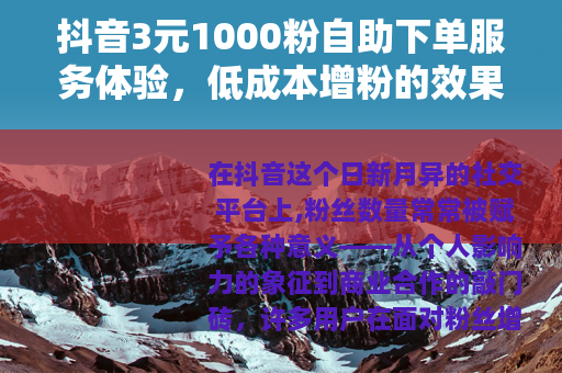 在抖音这个日新月异的社交平台上,粉丝数量常常被赋予各种意义——从个人影响力的象征到商业合作的敲门砖,许多用户在面对粉丝增长缓慢时,会寻找更快捷的途径,而“抖音3元1000粉自助下单”服务正是其中之一,作为一种低成本的自助式增粉选项,它在市场上悄然流行,吸引了众多想要快速提升账号数据的用户,我最初注意到这项服务,是在浏览一些社交媒体讨论区时,看到不少人提及它以极低的价格提供粉丝增长,出于好奇,我决定亲身尝试,并记录下整个过程,希望能为感兴趣的人提供一些实际的参考。
