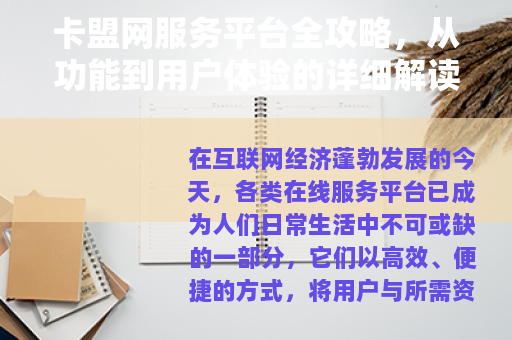 在互联网经济蓬勃发展的今天,各类在线服务平台已成为人们日常生活中不可或缺的一部分,它们以高效、便捷的方式,将用户与所需资源连接起来,大大简化了传统交易流程,在这众多平台中,卡盟网以其独特的定位和综合性服务,逐渐积累了一批忠实用户,本文将从卡盟网的起源、功能特点、实际使用体验、行业背景以及未来可能性等方面,进行细致入微的阐述,帮助读者更全面地理解这个平台的实际运作和价值所在,文章旨在提供实用信息,避免泛泛而谈,而是通过具体分析和用户视角,呈现一个真实且立体的卡盟网。