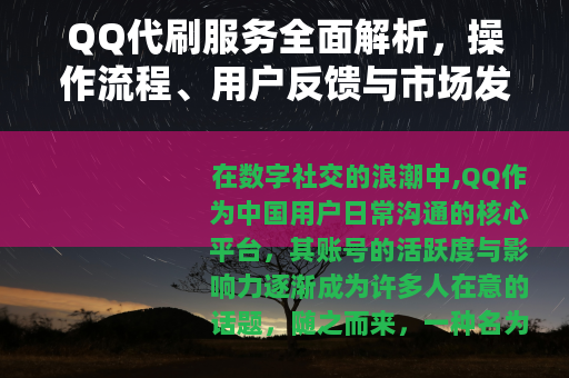 在数字社交的浪潮中,QQ作为中国用户日常沟通的核心平台,其账号的活跃度与影响力逐渐成为许多人在意的话题,随之而来,一种名为“QQ代刷”的服务悄然兴起,它通过第三方手段帮助用户提升粉丝数、点赞量或阅读数据,成为不少人在管理社交形象时的选择,本文将以平实的笔触,深入聊聊这一现象,从它的运作方式、用户动因到市场演变,希望能为读者提供一个清晰而全面的画面,而不带任何夸张或渲染。