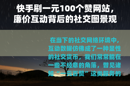 在当下的社交网络环境中,互动数据仿佛成了一种显性的社交货币,我们常常能在一些不经意的角落,瞥见诸如“一元百赞”这类服务的零星广告,它们静静地躺在某个论坛的尾页,或是随着一条群聊信息一闪而过,这现象平常得几乎让人忽视,却又实实在在地存在着,构成了一幅独特的网络生态侧面图,它不惊天动地,却牵连着许多普通用户的寻常心理与平凡期望。