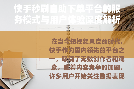 在当今短视频风靡的时代,快手作为国内领先的平台之一,吸引了无数创作者和观众,随着内容竞争的加剧,许多用户开始关注数据表现,比如视频的点赞量、评论数和粉丝增长,这催生了一种服务模式——快手秒刷自助下单平台,它为用户提供了一种便捷的方式来提升互动指标,这类平台通常以网站或应用的形式存在,允许用户自主选择服务类型,如下单增加点赞、评论或粉丝,并通过在线支付完成交易,系统随后自动或人工执行任务,这种现象不仅反映了数字内容生态的多样化,也引发了关于用户体验和市场动态的讨论。