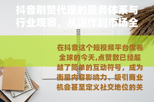 在抖音这个短视频平台席卷全球的今天,点赞数已经超越了简单的互动符号,成为衡量内容影响力、吸引商业机会甚至定义社交地位的关键指标,无论是刚入门的新手创作者,还是深耕多年的品牌商家,都或多或少地感受到那份对点赞数量的渴望,这种渴望并非凭空而来——在算法驱动的流量分配中,高点赞视频往往能获得更广泛的推荐,从而进入良性循环,一个衍生行业悄然兴起:抖音刷赞代理,这些代理通过提供点赞增加服务,帮助用户在数字竞争中抢占先机,本文将以平实的笔触,深入探讨这一行业的运作细节、市场格局及其背后的社会动态,避免泛泛而谈,力求呈现一个立体而真实的图景。