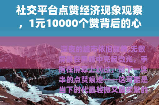 深夜的城市依旧醒着,无数屏幕在黑暗中亮起微光,手指在屏幕上划过,留下一连串的点赞痕迹——这可能是当下时代最轻微又最频繁的社交动作,不知从何时起,一种特殊的“服务”在网络的某些角落悄然生长:只需极低的费用,便能获得数量惊人的点赞,当“1元10000个赞”这样的字眼出现时,它像一个平静湖面投下的石子,涟漪之下,藏着我们这个时代社交互动中一些值得品味的褶皱。