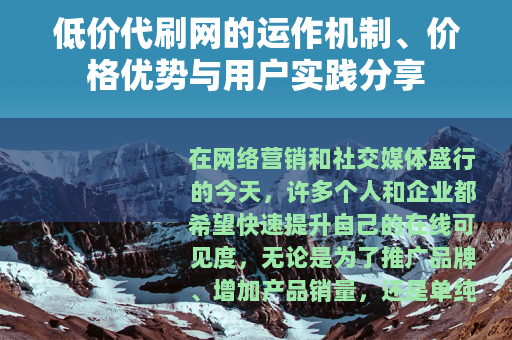 低价代刷网是一个复杂而多面的现象,它源于人们对网络影响力的追求,通过技术手段和市场竞争,以低廉的价格提供服务,用户在选择和使用这些服务时,需要基于自身情况进行评估,而平台则需在效率和品质之间找到平衡,本文通过分享运作机制、价格优势和用户实践,希望能为读者提供一个全面的视角,在快速变化的数字时代,低价代刷网或许只是冰山一角,但它提醒我们,网络成功的背后,往往是需求、技术和策略的交织,对于那些寻求快速起步的人来说,它可能是一个有用的工具;而对于整个行业,它则是一个值得观察的动态部分,通过理性分析和实践分享,我们可以更好地理解这一现象,并在自己的网络旅程中做出更明智的选择。 基于一般观察和用户分享,旨在提供信息参考,不构成具体建议,在实际操作中,请根据个人情况谨慎决策。)