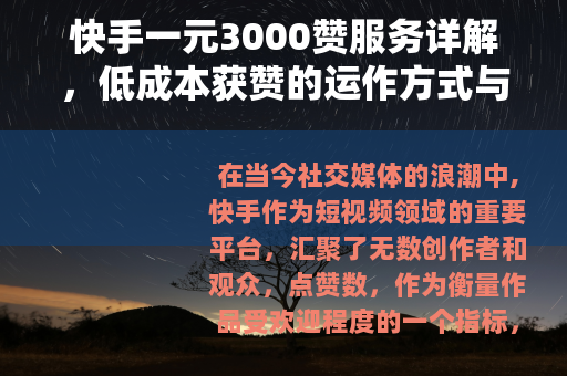 在当今社交媒体的浪潮中,快手作为短视频领域的重要平台,汇聚了无数创作者和观众,点赞数,作为衡量作品受欢迎程度的一个指标,常常成为用户关注的焦点,近年来,一种被称为“一元3000赞”的服务在快手上逐渐流行起来,它以极低的价格提供大量点赞,吸引了不少创作者的尝试,这种现象背后,既有用户对快速提升作品热度的渴望,也涉及平台生态的复杂互动,本文将从多个层面展开分析,探讨这一服务的具体运作、用户动机、实际影响以及替代方案,希望能为读者提供一个较为全面的视角。