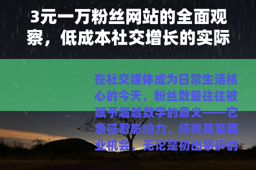 在社交媒体成为日常生活核心的今天,粉丝数量往往被赋予超越数字的意义——它象征着影响力、信誉甚至商业机会,无论是初出茅庐的内容创作者、渴望曝光的小企业,还是希望建立个人品牌的普通人,快速积累粉丝似乎是一条捷径,一种被称为“3元一万粉丝网站”的服务悄然兴起,它以极低的价格承诺大量粉丝,吸引了许多人的目光,这些网站通常标榜着“廉价高效”,只需支付少量费用,就能在短时间内让社交媒体账号的关注者数量飙升,但这种现象背后,不仅仅是简单的交易,还涉及技术运作、市场心理和长期影响,本文将通过个人经历、行业案例和客观分析,深入探讨这一主题,旨在提供一个平衡的视角,帮助读者理解其实际应用和潜在考量。