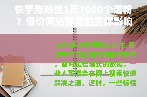 在快手上获得更多关注,是许多内容创作者的日常思考,面对缓慢增长的数据,一些人可能会在网上搜索快速解决之道,这时,一些标榜“快手涨粉丝1元1000个活粉”的网站或广告,便悄然出现在搜索结果或社群角落,它们往往设计得简单直接,用巨大的价格反差吸引眼球,承诺以几乎可忽略的成本,带来可观的粉丝数量,这种宣传,很容易让正处于焦虑或急切阶段的人心动。