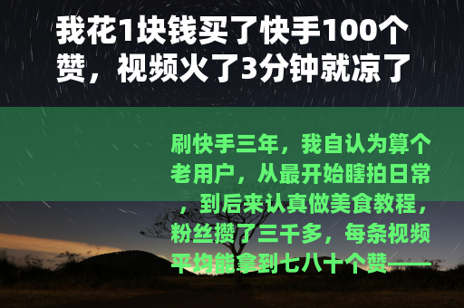 事情是这样的,我做了一条“10分钟搞定上班族午餐”的教程,剪辑花了两个半小时,封面改了四版,凌晨一点发出去,第二天早上醒来,赞:23个,播放量:400出头,我盯着那个数字发了会儿呆,手指不自觉地就滑进了快手首页那些“低价起量”的广告,一个叫“闪电赞哥”的账号写着:“1元100赞,真人活跃号,秒到。”我鬼使神差地扫了码,付了一块,然后把视频链接发过去,对面秒回:“收到,5分钟。”