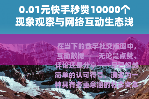 在当下的数字社交版图中,互动数据——无论是点赞、评论还是分享——早已超越简单的认可符号,演变为一种具有多重意涵的社会资本,我们时常能在某些网络角落看到极具冲击力的广告语:“0.01元,即刻获得10000个快手点赞”,这个看似荒诞的数字组合,如同一枚投入湖面的石子,激起的涟漪让我们得以窥见水面之下复杂而活跃的生态运作,它不仅仅是一个冰冷的交易标价,更是一扇窗口,透过它,我们可以观察到内容创作、流量逻辑、用户心理与平台机制之间微妙而持续的互动。