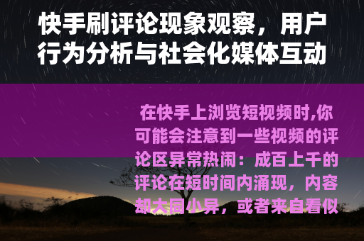在快手上浏览短视频时,你可能会注意到一些视频的评论区异常热闹:成百上千的评论在短时间内涌现,内容却大同小异,或者来自看似陌生的账号,这种现象,通常被称为“刷评论”,正悄然影响着平台的互动氛围,它不像某些极端行为那样引人注目,却渗透在日常使用中,成为用户和平台都需面对的一个话题,这里,我们不打算用夸张的语言渲染,而是从实际观察出发,聊聊这一行为背后的逻辑、带来的变化,以及如何理解它在社会化媒体中的角色。