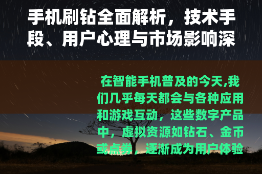 在智能手机普及的今天,我们几乎每天都会与各种应用和游戏互动,这些数字产品中,虚拟资源如钻石、金币或点券,逐渐成为用户体验的核心部分,它们能解锁新功能、加速进程或提升社交地位,但获取这些资源往往需要时间或金钱投入,一种称为“手机刷钻”的行为悄然兴起——用户通过技术手段,在非官方渠道快速获得虚拟钻石,这不仅仅是一个技术话题,更涉及用户行为、行业经济和社会文化等多个层面,本文将从实际角度出发,探讨手机刷钻的方方面面,避免泛泛而谈,而是通过细节和案例,呈现这一现象的复杂图景。