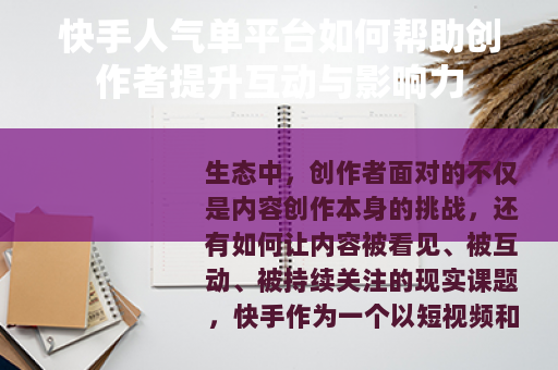 生态中,创作者面对的不仅是内容创作本身的挑战,还有如何让内容被看见、被互动、被持续关注的现实课题,快手作为一个以短视频和直播为核心的社区,其内在的推荐逻辑与互动机制,使得“人气”——即视频的播放量、点赞、评论、分享以及直播间的观看人数、互动频率——成为影响内容传播范围的关键要素之一,许多创作者在持续产出内容的同时,也会关注到,是否存在一些方法或途径,能够辅助性地为内容启动初期注入一些互动能量,从而更顺利地进入平台的推荐流量池,这就引出了一个常被提及的概念:快手人气单平台。