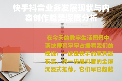 在今天的数字生活图景中,两块屏幕牢牢占据着我们的视线:一块是快手的双列瀑布流,另一块是抖音的全屏沉浸式推荐,它们早已超越了早期“短视频应用”的简单定义,演变为融合内容传播、社交互动、商业转化乃至文化塑造的复杂生态体系,当我们谈论“快手抖音业务”,所指的已不仅是两个平台的运营活动,而是一个庞大、动态、深刻影响社会肌理的数字经济与文化现象,这个领域没有一成不变的公式,有的只是在技术驱动、用户偏好与市场规律共同作用下的持续流变。