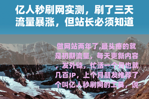 做网站两年了,最头疼的就是初期流量,每天更新内容,发外链,忙活一个月也就几百IP,上个月朋友推荐了个叫亿人秒刷网的工具,说能快速拉数据,我当时半信半疑——刷量这事听过太多,但自己从没试过。