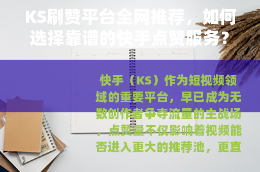 快手(KS)作为短视频领域的重要平台,早已成为无数创作者争夺流量的主战场,点赞量不仅影响着视频能否进入更大的推荐池,更直接关系到一个账号的冷启动速度。“刷赞”这个行为在圈内几乎成了公开的秘密,打开搜索引擎,输入“ks刷赞平台全网”,跳出来的结果成百上千,但你有没有想过——这些平台里,哪些是真的能用?哪些只是圈钱跑路的快招?作为在短视频运营圈摸爬滚打了三年的老手,今天我就把选平台的逻辑、避坑的办法、以及真实的使用体验,一次性讲清楚。