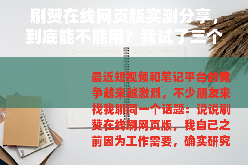 最近短视频和笔记平台的竞争越来越激烈,不少朋友来找我聊同一个话题:说说刷赞在线刷网页版,我自己之前因为工作需要,确实研究过一段时间这类工具——不是鼓励大家去刷,而是想弄明白它到底是怎么回事,能不能真的让内容“破圈”,今天就把我的测试经历和观察写下来,希望能帮你少走弯路。