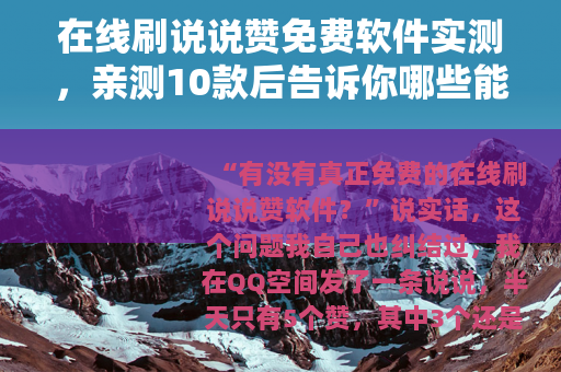 “有没有真正免费的在线刷说说赞软件?”说实话,这个问题我自己也纠结过,我在QQ空间发了一条说说,半天只有5个赞,其中3个还是我自己点的,朋友圈、微博、贴吧……好像哪儿都缺点赞,于是我也踏上了“找免费刷赞软件”的路,前前后后试了10多款,踩了不少坑,最后才搞明白这些软件到底怎么回事,今天就把我的真实经历和看法写下来,文中不玩虚的,该说的都说清楚。