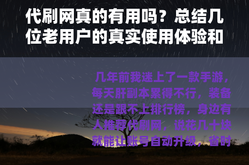 现在想想,代刷网的本质就是用“省时”换“风险”,如果你手头有重要的账号,或者里面存了真金白银,真心不建议去碰,哪怕只是玩个小号,也得问自己一句:省下的那点时间,值不值得赌上账号的安全?做任务、练级再累,起码每一步都是自己挣的,用着踏实,如果你实在想找人代刷,至少找那些支持“先验后付”、有真实交易记录的老店,并且只给临时密码、清空余额、解绑手机——多一步防护,少一堆麻烦。