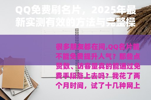 很多朋友都在问,QQ名片能不能免费提升人气?那些点赞数、访客量真的能通过免费手段涨上去吗?我花了两个月时间,试了十几种网上流传的方法,踩了无数坑,总算整理出一套真实可行的经验,这篇文章会把每一步都拆开讲清楚,不搞虚的,全是自己动手验证过的结果。