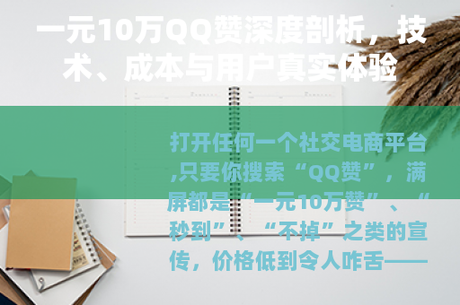 打开任何一个社交电商平台,只要你搜索“QQ赞”,满屏都是“一元10万赞”、“秒到”、“不掉”之类的宣传,价格低到令人咋舌——一块钱十万个赞,换算下来一个赞连0.0001元都不到,这背后到底是怎样一套逻辑?买了这些赞的用户到底经历了什么?本文不打算做任何营销或抨击,而是从技术原理、成本结构、实际效果这三个维度,把这件事掰开揉碎了讲清楚。