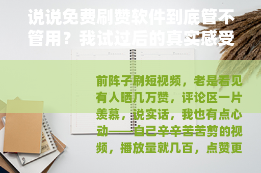 我现在宁愿每天花半小时研究标题和封面,或者去同领域的大号评论区互动,虽然涨粉慢,但每一个赞都是真实的人点的,那种感觉,和刷出来的空心数字完全不一样,如果你也在纠结要不要用免费刷赞软件,我的建议很直接——别碰,不信你可以自己试一次,然后看看后面几天账号的状态,就知道了。