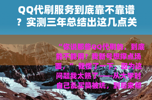 “你说那些QQ代刷的,到底能不能用?我新号想撑点场面。” 我愣了一下,因为这问题我太熟了——从大学时自己乱买赞被坑,到后来帮工作室测试过不下二十家代刷平台,前前后后折腾了快三年,你要是直接上网搜“QQ代刷”,满屏的广告词吹得天花乱坠:“秒到”、“不掉”、“全自动”,但真正用起来,里面门道多得能写本小说。
