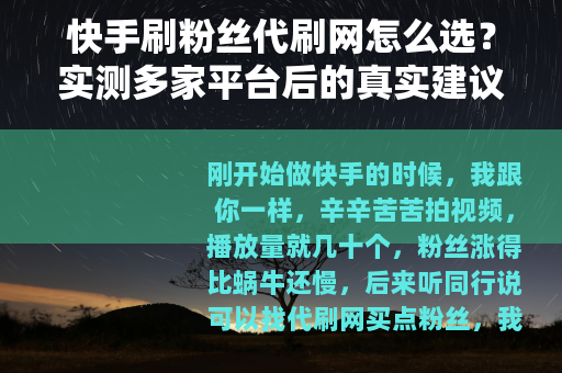 刚开始做快手的时候,我跟你一样,辛辛苦苦拍视频,播放量就几十个,粉丝涨得比蜗牛还慢,后来听同行说可以找代刷网买点粉丝,我就试了几家,踩过坑也捡到过宝,今天把这几个月用下来的真实感受写出来,给想走点“捷径”的朋友一个参考。
