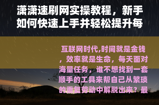 互联网时代,时间就是金钱,效率就是生命,每天面对海量任务,谁不想找到一套顺手的工具来帮自己从繁琐的重复劳动中解脱出来?最近在圈子里被反复提到的“潇潇速刷网”,似乎成了很多人的秘密武器,有人用它三天干完一周的活,有人靠着它把账号数据拉得漂漂亮亮,但同样的平台,为什么别人用得风生水起,你上手却觉得一头雾水? 就是为你准备的,我不打算给你画什么大饼,也不会堆砌那些你看不懂的术语,我会用最直白的话,把我在潇潇速刷网上的操作经验、踩过的坑、总结出来的技巧,一五一十地写出来,你只要跟着步骤来,哪怕之前完全没接触过这类工具,也能在半小时内搞明白怎么用,并且让自己的效率翻倍。