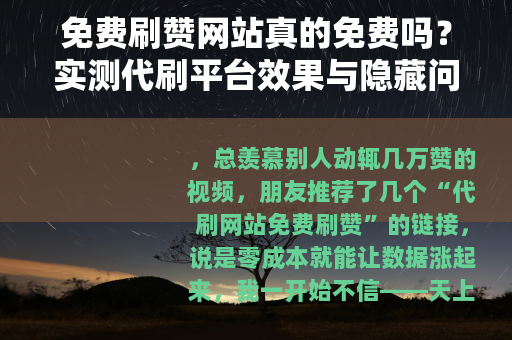 ,总羡慕别人动辄几万赞的视频,朋友推荐了几个“代刷网站免费刷赞”的链接,说是零成本就能让数据涨起来,我一开始不信——天上掉馅饼的事,真的存在?但架不住好奇心,花了三天时间,亲自测试了三个不同的免费刷赞平台,下面把整个过程和发现写出来,希望给同样在纠结的你一点参考。