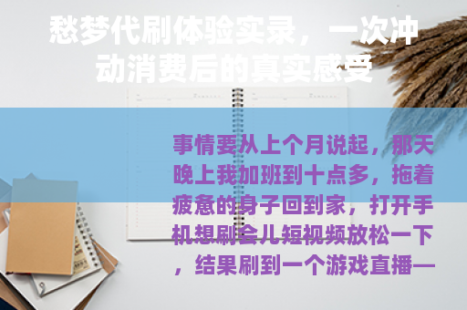 事情要从上个月说起,那天晚上我加班到十点多,拖着疲惫的身子回到家,打开手机想刷会儿短视频放松一下,结果刷到一个游戏直播——对方正在展示一套我梦寐以求的稀有装备,弹幕里有人问“怎么弄的”,主播随口说了句“找愁梦代刷就行”,我当时脑子一热,鬼使神差地点开了搜索框。