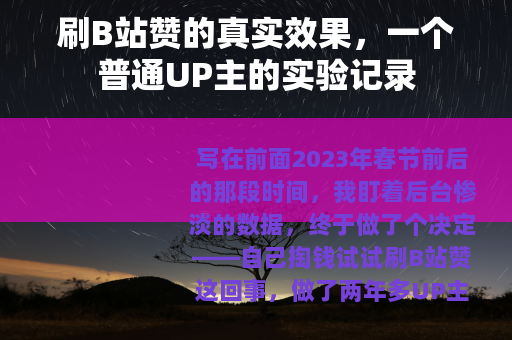 2023年春节前后的那段时间,我盯着后台惨淡的数据,终于做了个决定——自己掏钱试试刷B站赞这回事,做了两年多UP主,粉丝刚过千,视频播放量平均两三千,点赞更是可怜,十几个算好的,偶尔破百能高兴一整天,过年那段时间刷到好几个同类型账号突然爆火,评论区有人阴阳怪气“买赞的吧”,也有人说“人家内容好”,我忍不住想:如果我也刷一点赞,能不能打破这个死循环?