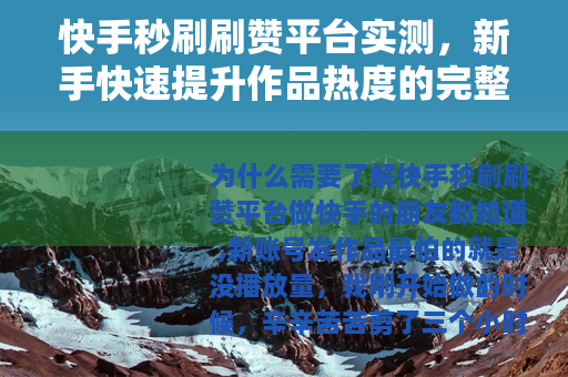 做快手的朋友都知道,新账号发作品最怕的就是没播放量,我刚开始做的时候,辛辛苦苦剪了三个小时的视频,发出去半天就几十个播放,连个赞都没有,后来听同行说可以试试刷赞平台,但网上一搜全是广告,真假难辨,上周我自费测试了市面上几个号称“秒刷”的平台,快手秒刷刷赞平台”算是体验比较特殊的一个,今天把整个过程和细节写出来,给同样想快速起号的朋友做个参考。
