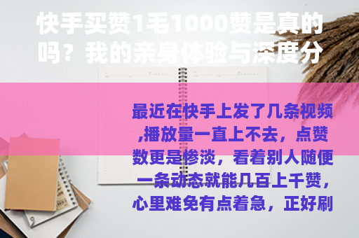 最近在快手上发了几条视频,播放量一直上不去,点赞数更是惨淡,看着别人随便一条动态就能几百上千赞,心里难免有点着急,正好刷到有人打出“1毛钱1000赞”的广告,当时第一反应是:这么便宜?不会是骗人的吧?但转念一想,就算被坑也就几块钱的事,不如试试看,于是我就花了三天时间,亲自测试了七八家不同的低价赞卖家,还顺带研究了背后的机制,这篇文章就把我所有的经历、观察和思考写下来,希望能给同样在纠结买赞的朋友一点参考。