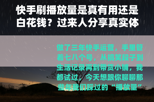 做了三年快手运营,手里管着七八个号,从搞笑段子到生活记录再到带货小铺,我都试过,今天想跟你聊聊那些年我们踩过的“播放量”坑——尤其是那种花钱刷出来的播放量,说实话,刚入行那会儿,我对这事也半信半疑,觉得数字能造假,平台肯定能看出来,但后来因为某个视频发了三天播放量连500都没过,心里一急,就试了一次,结果呢?有惊喜,也有教训,这篇文章不讲大道理,就说说我亲身折腾出来的那些门道。
