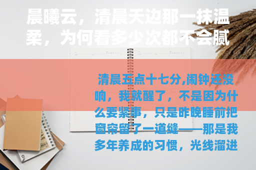 清晨五点十七分,闹钟还没响,我就醒了,不是因为什么要紧事,只是昨晚睡前把窗帘留了一道缝——那是我多年养成的习惯,光线溜进来,不是那种刺眼的白,是一种很淡很淡的、像被水泡过的橘色,温柔得不像话,我翻身坐起来,赤脚走到窗边,看到了这一天的第一片云。
