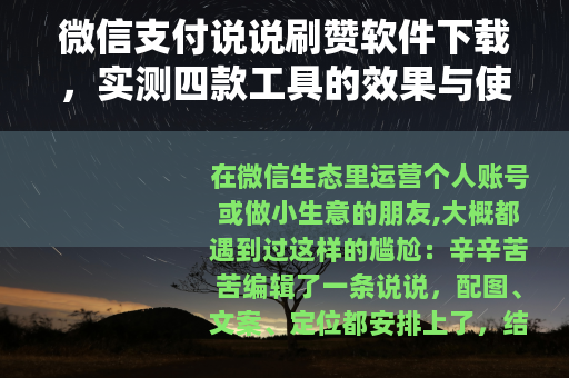 在微信生态里运营个人账号或做小生意的朋友,大概都遇到过这样的尴尬:辛辛苦苦编辑了一条说说,配图、文案、定位都安排上了,结果发出去半天,点赞数还是寥寥无几,朋友圈社交讲究“互动感”,点赞多不仅看着有面子,还能间接提升后续内容的曝光权重,于是不少人开始搜索“微信支付说说刷赞软件下载”——我本人也是其中一个,前后下载试用了七八款工具,踩过不少坑,也找到几个相对靠谱的,今天就把自己的实测经历和选型思路写下来,希望对有同样需求的朋友有点帮助。