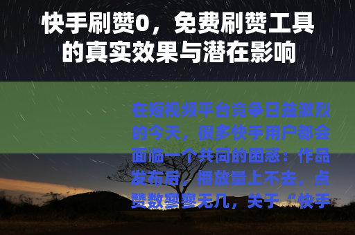 在短视频平台竞争日益激烈的今天,很多快手用户都会面临一个共同的困惑:作品发布后,播放量上不去,点赞数寥寥无几,关于“快手刷赞0”的搜索词频繁出现在各大搜索引擎中,各种号称“免费刷赞”“零成本涨赞”的工具和教程层出不穷,作为一个在短视频领域摸爬滚打多年的创作者,我见过太多人为了那几十个赞费尽心思,也见过不少人因为使用了某些所谓的“免费工具”而付出惨痛代价,我不说教,也不危言耸听,只想从技术逻辑、平台规则、实际效果三个层面,跟你聊聊“快手刷赞0”这件事到底是怎么回事。