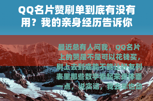 最近总有人问我,QQ名片上的赞是不是可以花钱买,刷上去到底能不能让好友列表里那些数字看起来更体面一点,说实话,我去年也动过这个念头,前后试了两三种路子,花了几十块钱,也算踩过坑,今天就把这些乱七八糟的体验摊开来聊聊,希望能给正在犹豫的朋友一点参考。