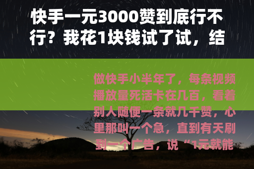 做快手小半年了,每条视频播放量死活卡在几百,看着别人随便一条就几千赞,心里那叫一个急,直到有天刷到一个广告,说“1元就能买3000赞”,我第一反应是:这么便宜?假的吧?但转念一想,才1块钱,试试又不会少块肉。