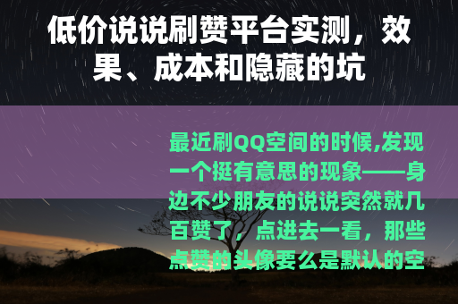最近刷QQ空间的时候,发现一个挺有意思的现象——身边不少朋友的说说突然就几百赞了,点进去一看,那些点赞的头像要么是默认的空白,要么是一串乱码,我心想,这八成是买了那种传说中的“低价说说刷赞平台”吧?我自己平时也爱发点生活动态,但点赞数总是两位数徘徊,偶尔三位数就开心半天,出于好奇,我决定亲自下场,把市面上能搜到的低价刷赞平台挨个试一遍,看看它们到底能给我带来什么。