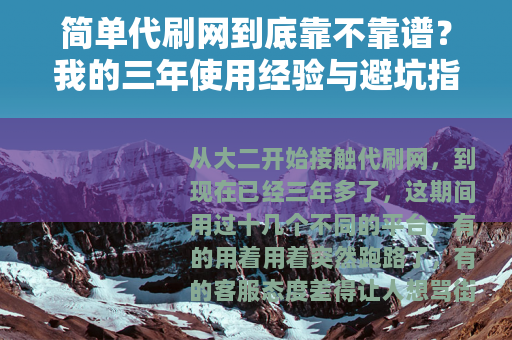 从大二开始接触代刷网,到现在已经三年多了,这期间用过十几个不同的平台,有的用着用着突然跑路了,有的客服态度差得让人想骂街,当然也遇到过几个确实不错的,今天就想跟各位聊聊,简单代刷网”这个关键词背后,那些真实的使用体验和选择技巧,如果你也想给自己的账号刷刷播放量、涨涨粉丝,或者单纯想看看这些平台到底怎么运作的,那这篇文章应该能帮到你。