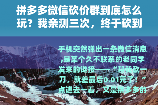 手机突然弹出一条微信消息,是某个久不联系的老同学发来的链接——“帮我砍一刀,就差最后0.01元了!”点进去一看,又是拼多多的砍价免费拿,刚开始我还挺热心,觉得举手之劳,后来发现砍来砍去永远差那么一点,干脆自己也开始研究起那些所谓的“拼多多微信砍价群”。