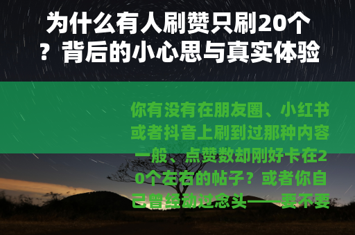你有没有在朋友圈、小红书或者抖音上刷到过那种内容一般、点赞数却刚好卡在20个左右的帖子?或者你自己曾经动过念头——要不要买几个赞?最后想了想,算了,就买20个吧。