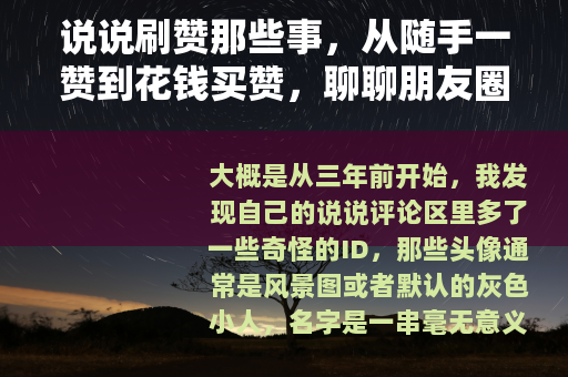 大概是从三年前开始,我发现自己的说说评论区里多了一些奇怪的ID,那些头像通常是风景图或者默认的灰色小人,名字是一串毫无意义的字母数字组合,他们在我的说说下面留下“点个赞”的评论,有时候还会附上一个笑脸,起初我以为是什么新功能,后来才发现,原来这就是传说中的“刷赞”。