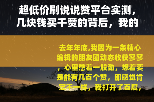 去年年底,我因为一条精心编辑的朋友圈动态收获寥寥,心里憋着一股劲,想着要是能有几百个赞,那感觉肯定不一样,我打开了百度,搜了“说说赞怎么买”“低价点赞平台”,结果跳出来一堆链接,个个都写着“1元100赞”“10元包万赞”“超低价刷说说赞平台,全网最低”,我当时想,几块钱的事,试试又不亏。