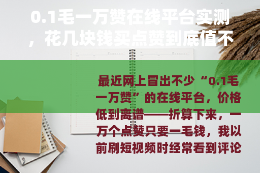 最近网上冒出不少“0.1毛一万赞”的在线平台,价格低到离谱——折算下来,一万个点赞只要一毛钱,我以前刷短视频时经常看到评论区有人晒单,有的说“几分钟就涨了几千赞”,有的抱怨“点赞全是僵尸号,毫无效果”,出于好奇,我花了几块钱试了两个不同的平台,想看看这种价格背后到底是真划算还是纯属浪费钱。