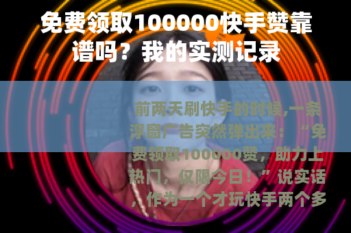 前两天刷快手的时候,一条浮窗广告突然弹出来:“免费领取100000赞,助力上热门,仅限今日!”说实话,作为一个才玩快手两个多月的新手,我每次发完视频都眼巴巴盯着那几十个赞,突然看到10万个数字,心跳都漏了一拍,要是真能拿到,那不得直接起飞?我手指一抖就点了进去,然后开始了长达一小时的折腾——今天就来把整个过程和我的反思都写出来,给同样心动的朋友做个参考。