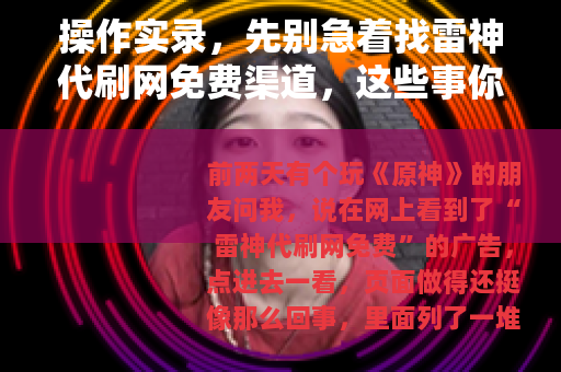 前两天有个玩《原神》的朋友问我,说在网上看到了“雷神代刷网免费”的广告,点进去一看,页面做得还挺像那么回事,里面列了一堆游戏币、稀有道具的领取流程,他问我:“这东西靠谱吗?要不要试试?”我愣了几秒,因为我知道他问的“雷神代刷”不是那个游戏里雷电将军的角色代刷,而是一个打着“免费赠送游戏资源”名号的网站。